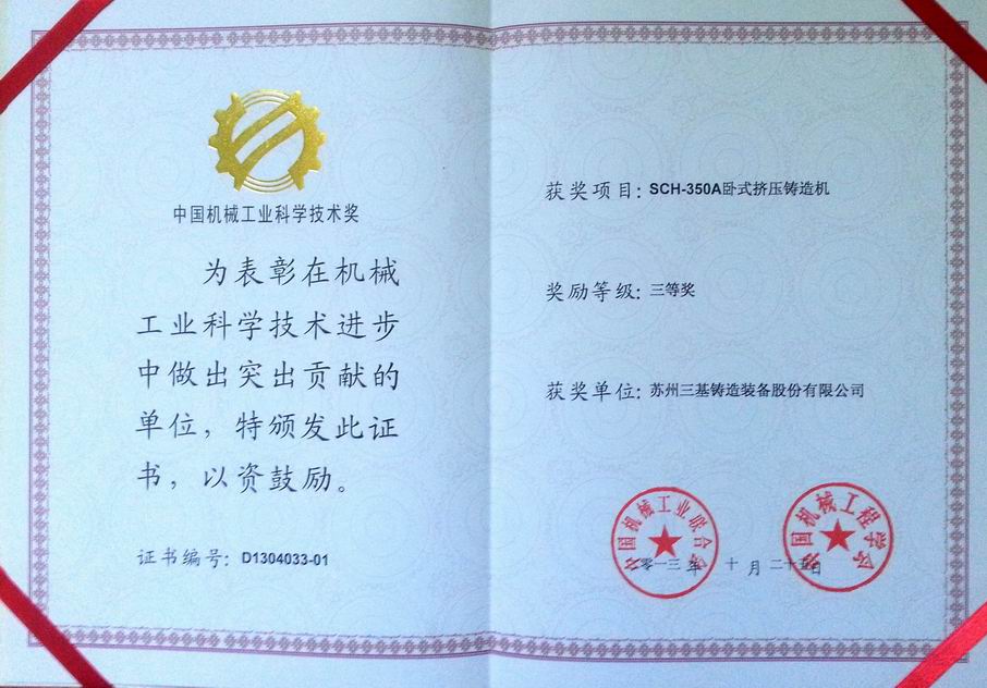 2008年,公司自主研發(fā)的SCH-350A臥式擠壓鑄造機,在2011年獲得國家重點新產(chǎn)品的之后,再次獲得了2013年中國機械工業(yè)科技進步獎三等獎殊榮。